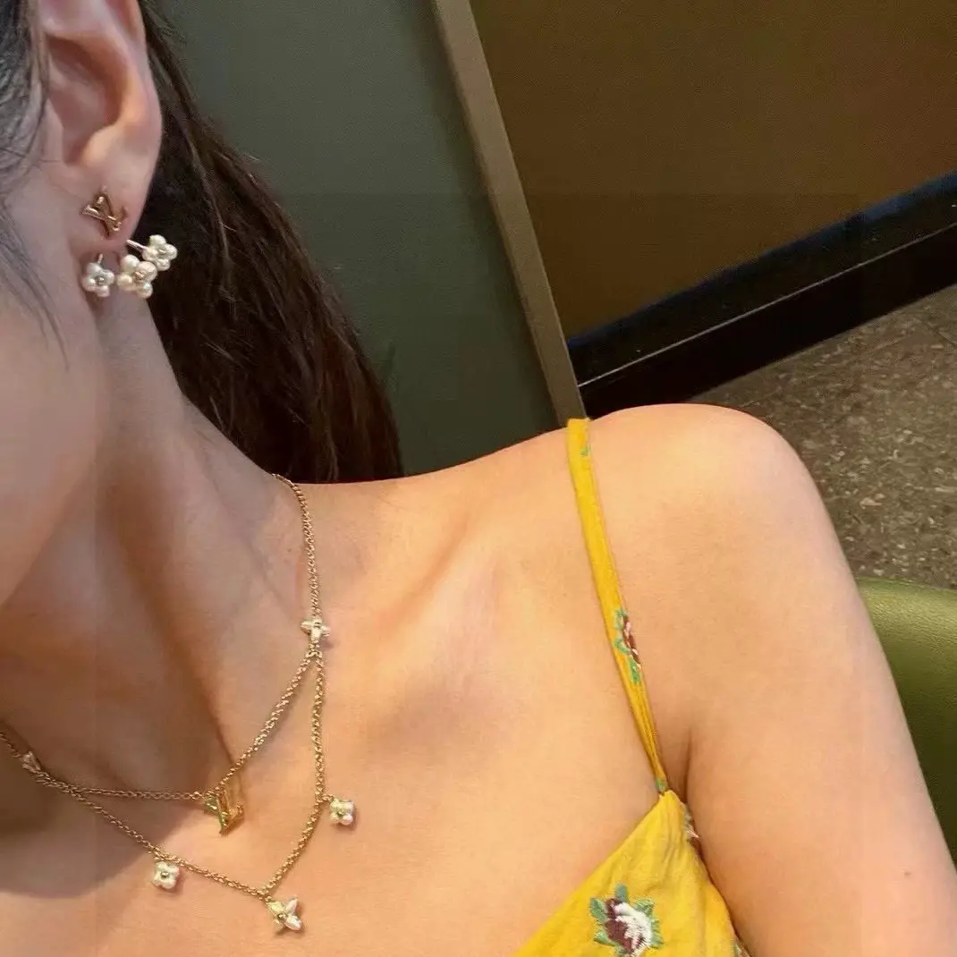 Diseño exclusivo de LV: pendientes con flores de perla lustrosa y letras LV doradas (metal bañado en oro 18K) como centro decorativo, combinando elegancia natural y identidad de marca. Ligeras y confortables, con cierre seguro para orejas sensibles (incluye clips para orejas sin piercing). Longitud ajustable (5-7 cm) para adaptarse a estilos variados. Materiales hypoalérgicos y resistentes, perfectas para uso diario o eventos especiales. La perla añade softness, mientras que las letras LV doradas aportan un toque generoso y exquisito, reflejando el lujo atemporal de la marca. Limpia con un paño suave para preservar su brillo. #LVPendientesPerla #FlorLetrasLV #JoyeriaExquisita